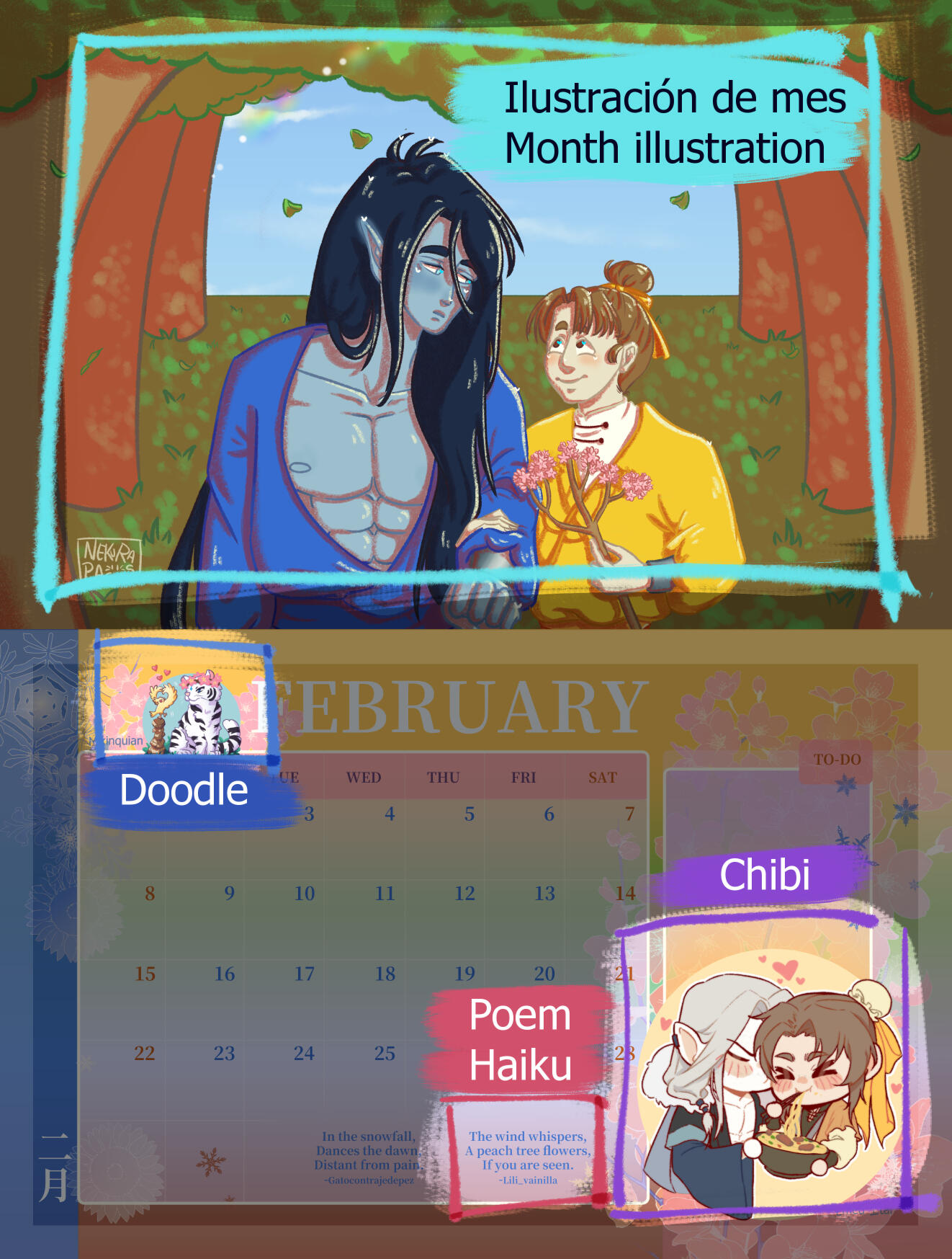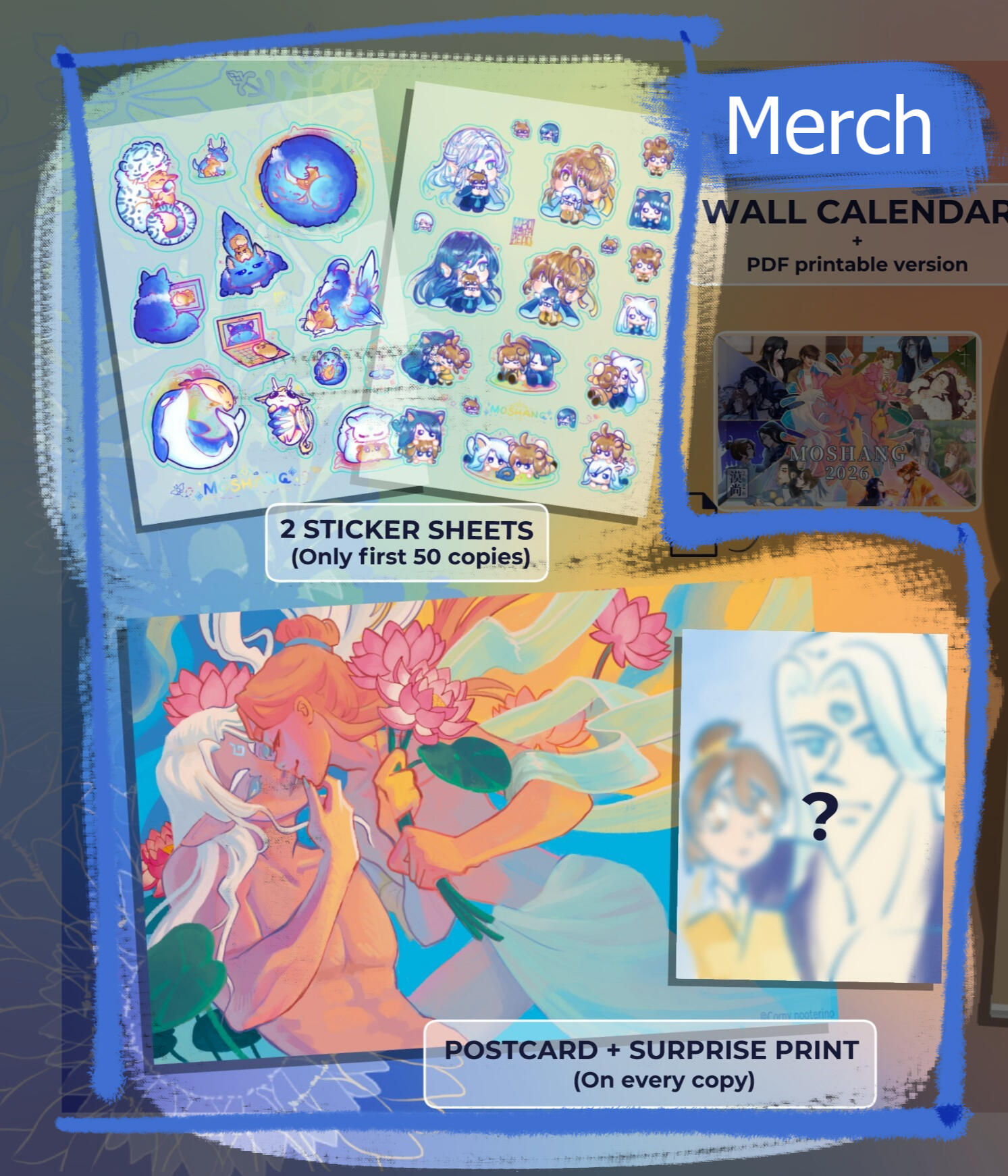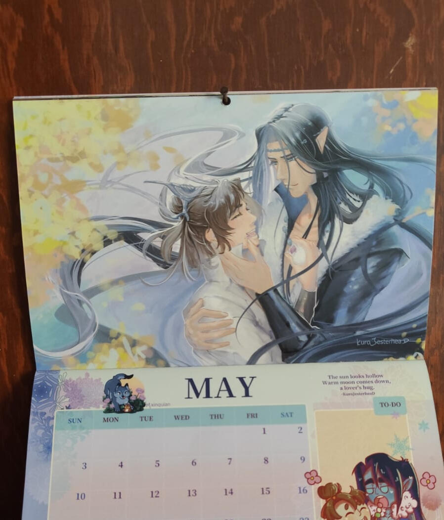 El Calendario Moshang es un proyecto fanart pago por producción (p4p) enfocado en la pareja canon de MXTX Shang Qinghua y Mobei Jun de la novela The Scum Villain’s Self-Saving System.En otras palabras, es un proyecto creado para chefs de Moshang dispuestos a cocinar deliciosos platillos para el resto de la familia Moshang, con contribuciones de ilustradores, escritores y cosplayers de distintas nacionalidades.Las copias físicas están disponibles únicamente durante las preventas o como sobrantes, pero si te lo perdiste, aún puedes descargar la versión digital para imprimir.