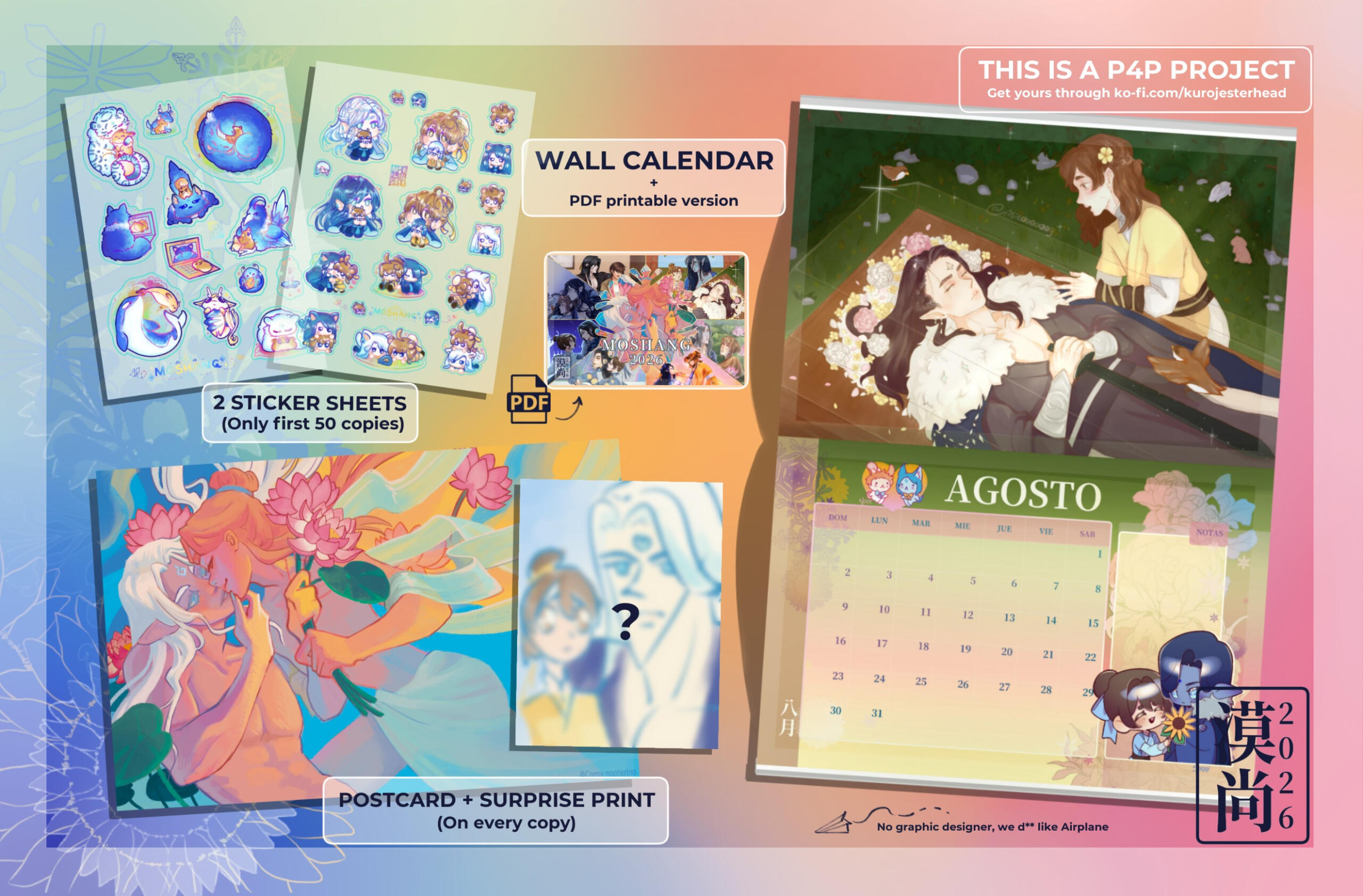 El Calendario Moshang es un proyecto de fanart pago por producción (p4p) centrado en la pareja canon de MXTX Shang Qinghua y Mobei Jun de la novela The Scum Villain’s Self Saving System.En otras palabras, es un proyecto creado por chefs Moshang que disfrutan de cocinar migajas para el resto de la familia Moshang, teniendo asi la participación de 26 ilustradores, escritores y cosplayers de distintas nacionalidades.❄️Lo que incluye tu pago:
